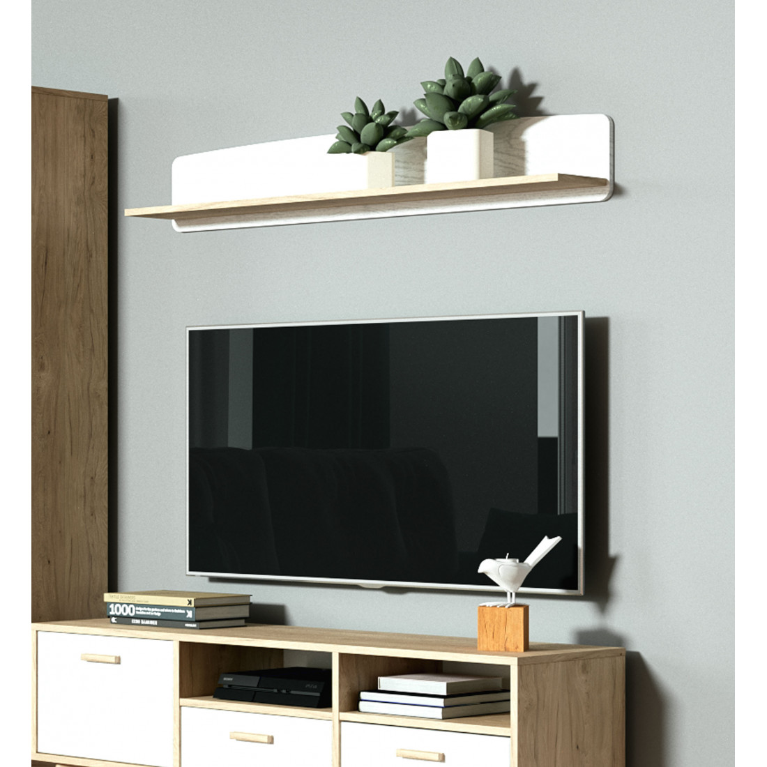 Ультратрендовая полка Калгари от Мебельград, выполненная в светлых тонах с элементами сдержанного стиля 60-х - выраженная деревянная текстура натурального дуба, четкие формы. Вся мебель очень мобильная, компактная, вызывает чуство легкости и свободного пространства, при этом она функциональна.