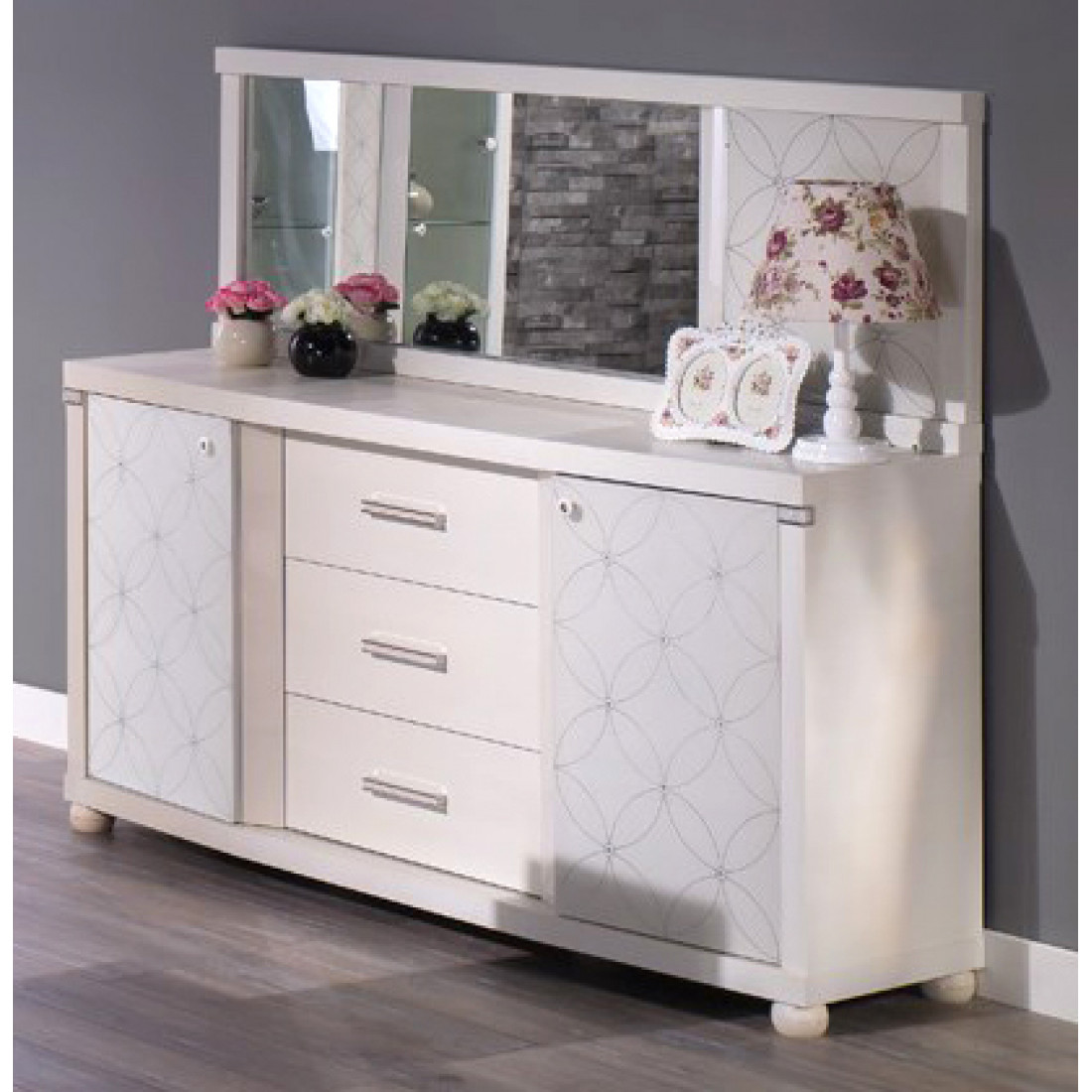 Прямоугольное настенное зеркало MIRA-10 (белое) серии Мира от Беллона предлагается в качестве комплекта к удлиненному комоду. Такуже купить стильно оформленное настенное зеркало можно отдельно. Оно добавить лоска и очарование в общий интерьер, станет притягательным элементом декора: интересное деление на ассиметричные секции дополняется глухой вставкой из матового каленого стекла с лаконичным орнаментом в виде сходящихся соцветий, окончания листьев рисунка украшены стразами Swarovski.