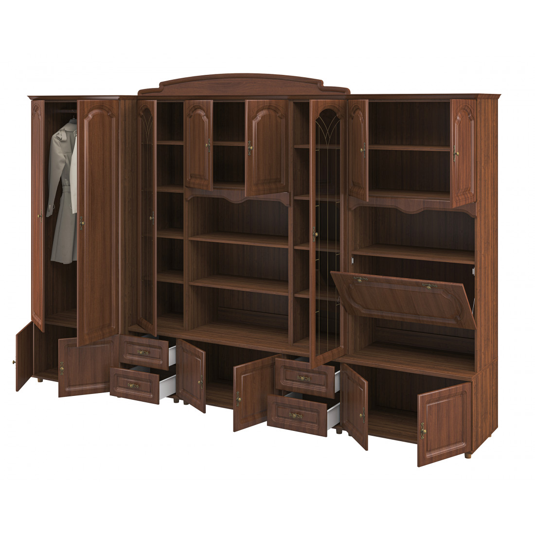 Стенка в гостиную "Романитка" не устаревающая классика на все времена.Длина стенки 3240мм, высота 2180мм, глубина 610мм. Вместительный шкаф для одежды, закрытые полочки для белья, ящики для хранения вещей , ниша под ТВ . Многофункциональная, в классическом цвете "орех темный" стенка в гостиную "Романитка ВК-09.01" отлично впишется в интерьер дома, квартиры, уютного коттеджа.