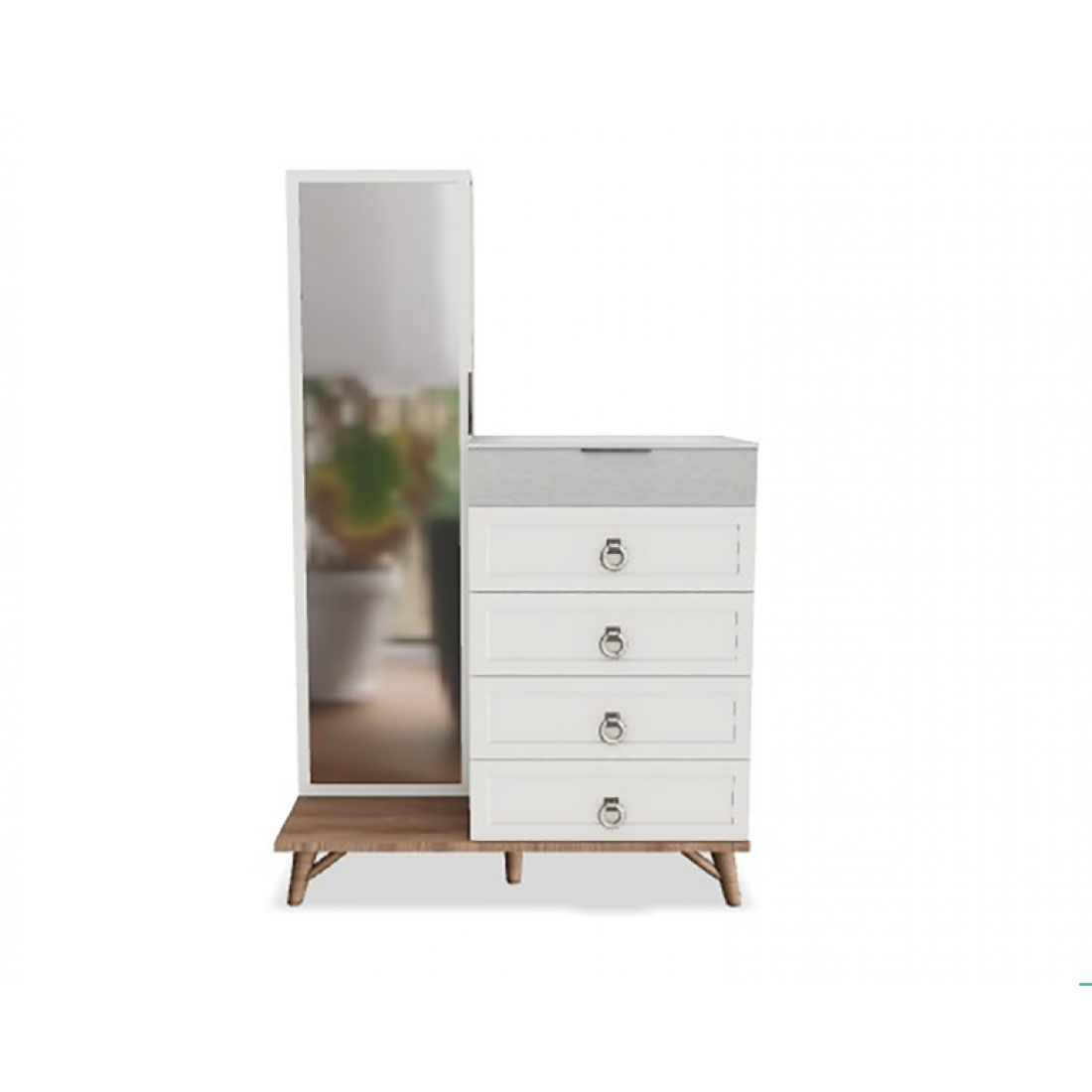 Туалетный комод с ящиками и зеркальным шкафом с полками из серии Мавенна. Верхний ящик предназначен для хранения ювелирных изделий. Цвет бежевый/ серый. Изготовлен из ЛДСП высокого качества.