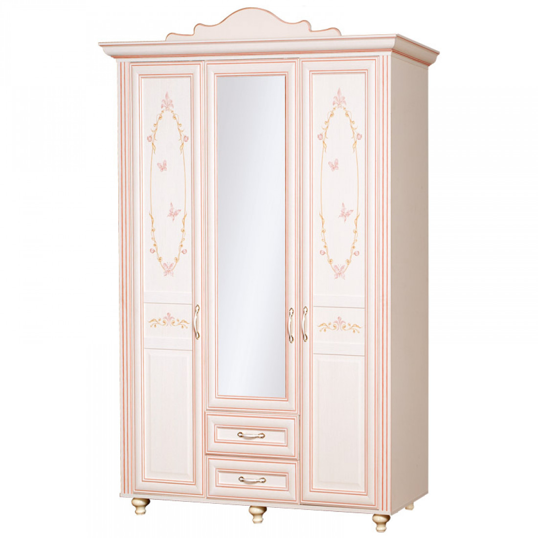 Фасады: МДФ, декор – кремовый белый, рисунок, патина, стекло с фацетом и рисунком